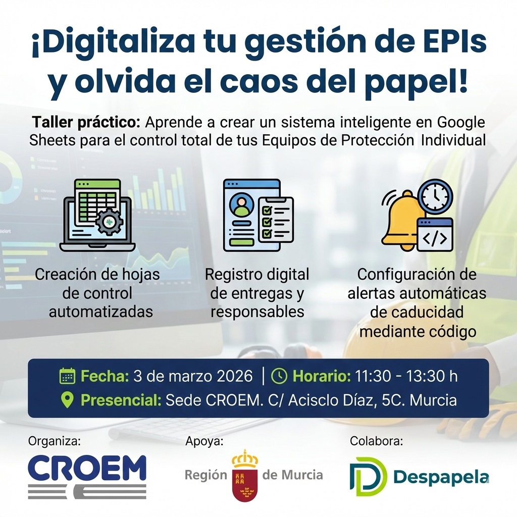 Durante la sesión, los asistentes aprenderán a crear un sistema inteligente en Google Sheets para automatizar el control de EPIs, registrar entregas y responsables y configurar alertas automáticas de caducidad, mejorando la trazabilidad y la eficiencia en la gestión preventiva.
