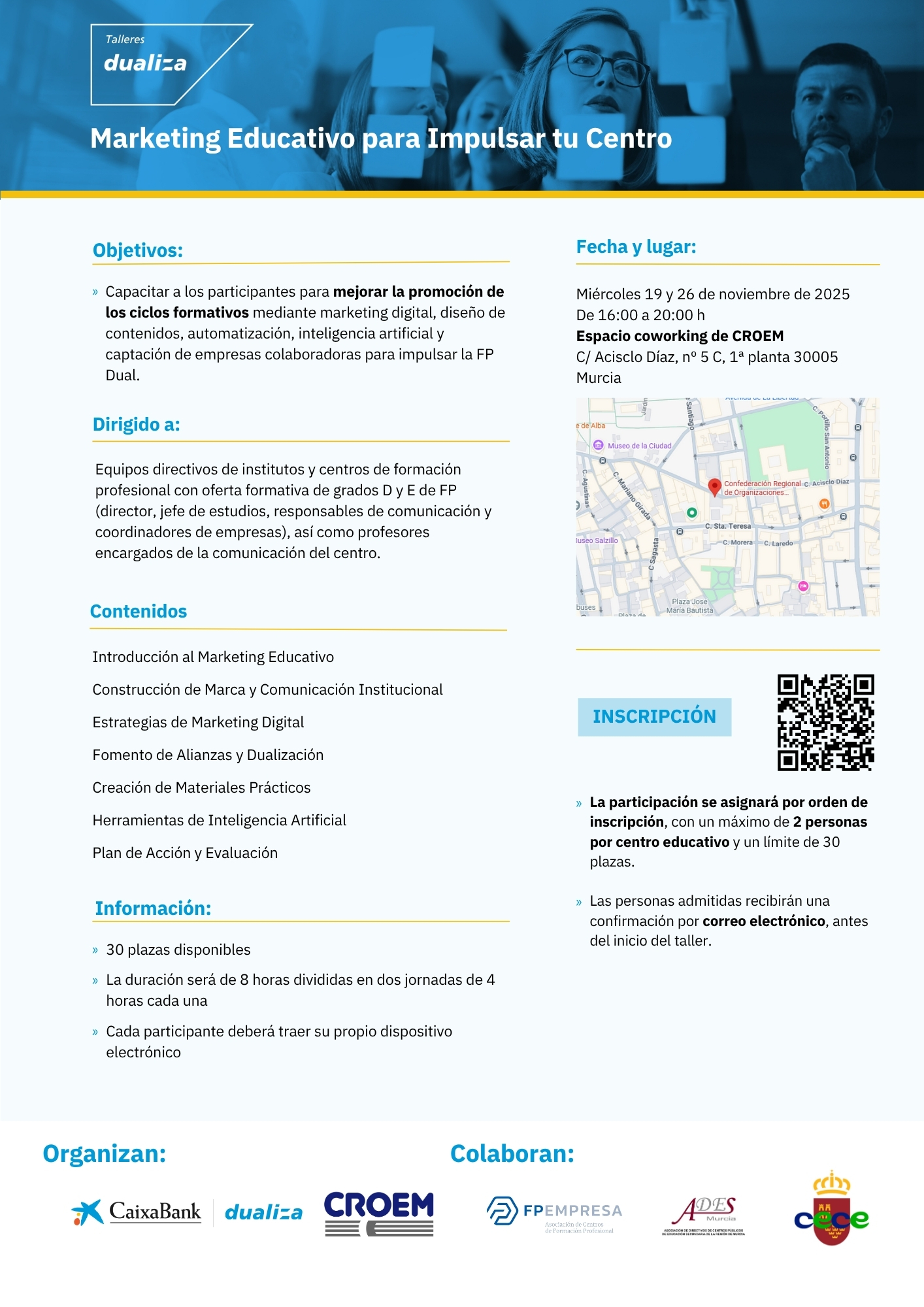 Lugar de impartición: Espacio coworking de CROEM, C/ Acisclo Díaz, nº 5 C, 2ª planta 30005 Murcia